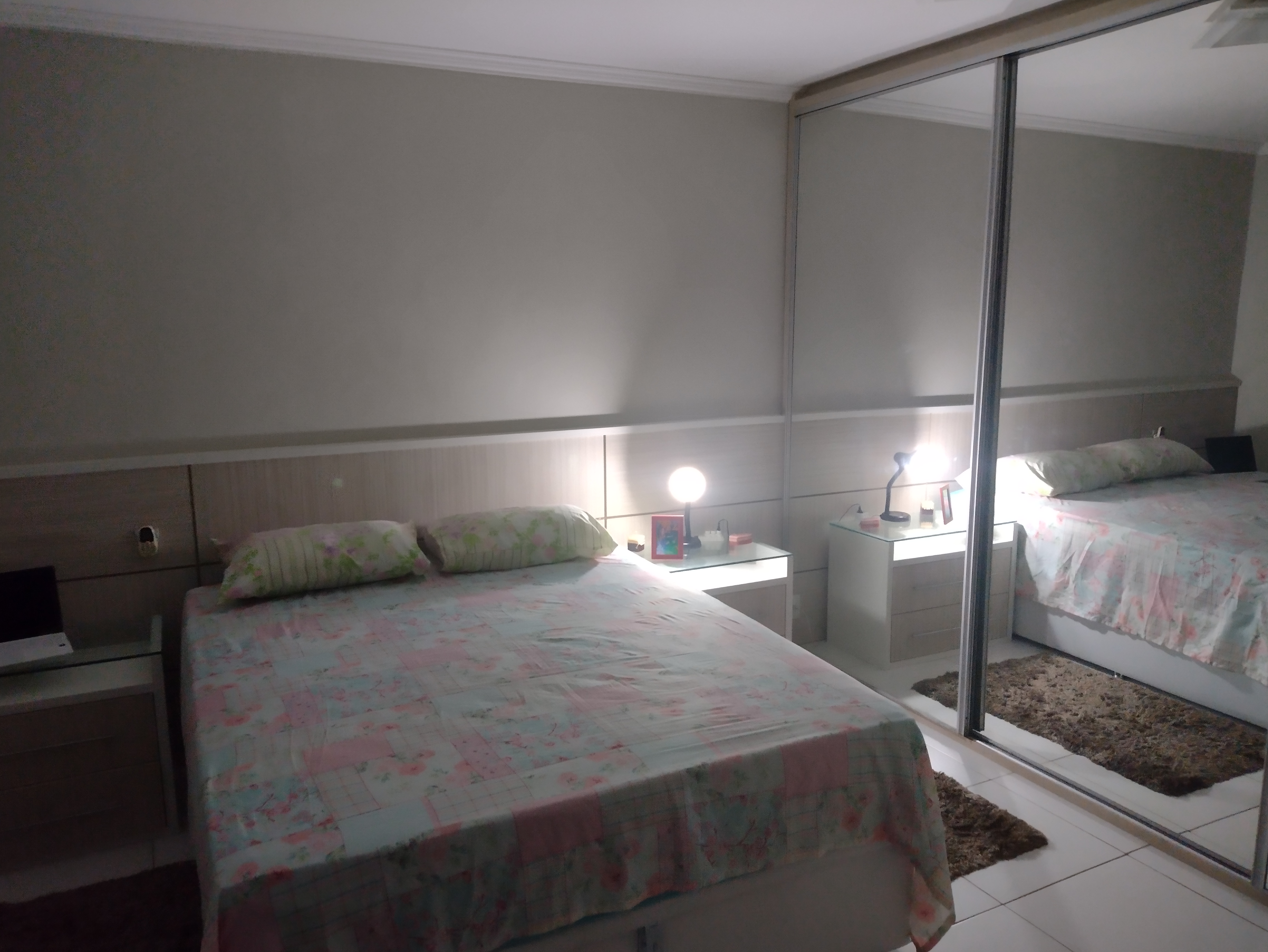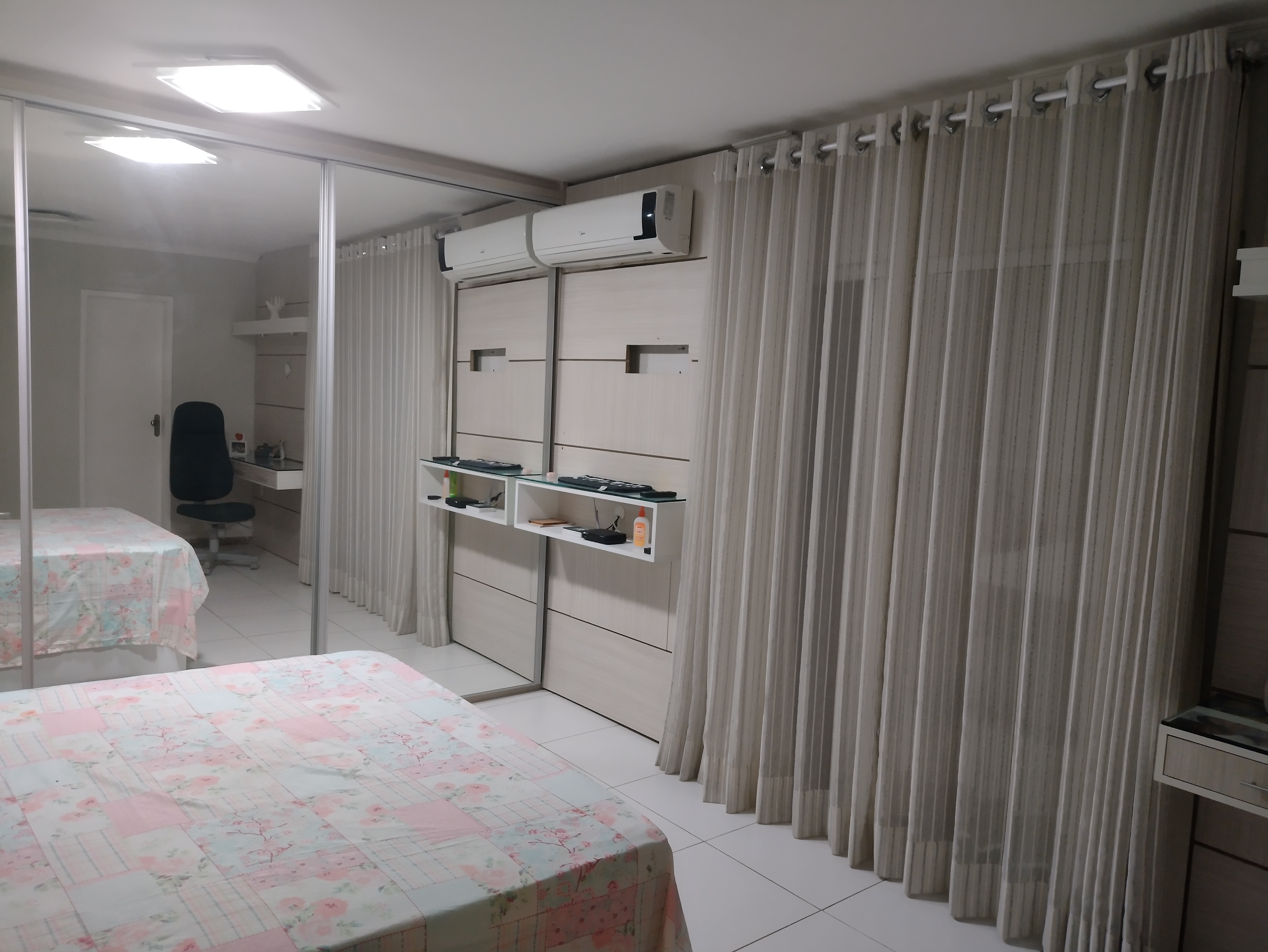 * Três quartos, todos com ar condicionado, sendo dois com sacada e um quarto com suíte, totalizando quatro banheiros;